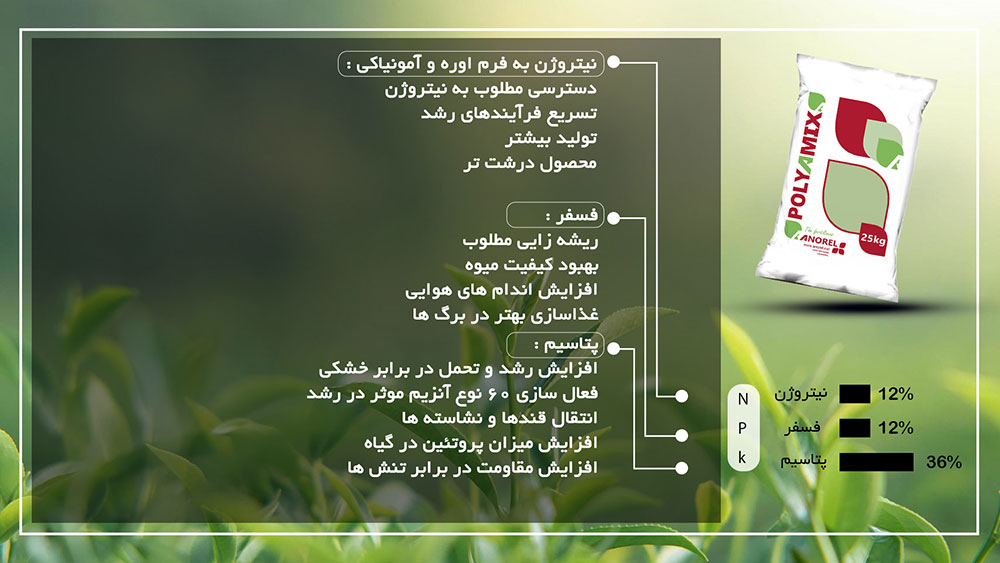 کود ان پی کا 36 12 12 آنورل دارای درصد متعادلی از دو عنصر مهم نیتروژن و فسفر است که به دلیل پتاسیم بالا و همچنین مواد معدنی ریز مغذی مثل آهن، منگنز،بور ،روی باعث افزایش گلدهی گیاهان و افزایش تحمل گیاه در برابر سرما و تنشهای محیطی مشود.این کود فاقد عناصر کلر و سدیم و فلزات سنگین است
